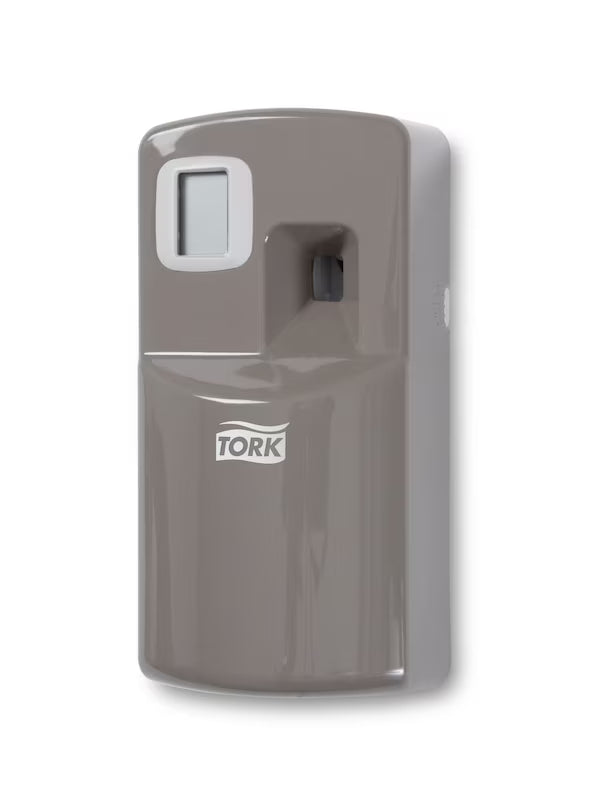 Dispenserul pentru odorizant Tork A1 asigură o distribuire automată și controlată a parfumului, contribuind la menținerea unui mediu proaspăt și plăcut. Modelul gri se integrează discret în orice tip de baie sau spațiu public.