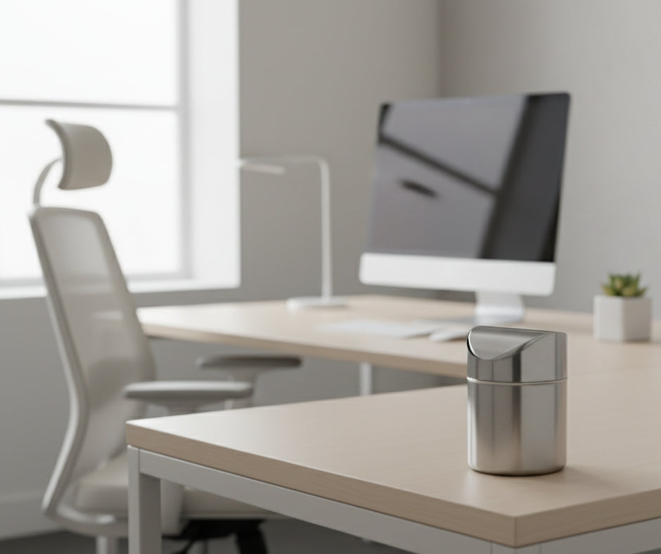 Coșul de gunoi mini este o soluție practică pentru menținerea curățeniei în spațiul de lucru.