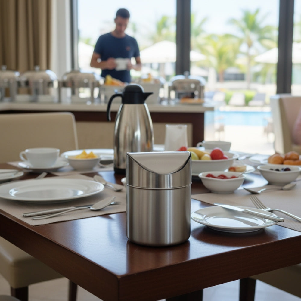 Coșul de gunoi din inox are 1.25 L si datorită dimensiunilor sale compacte, se integrează perfect pe birourile executive, pe blaturile de bucătărie, lângă zona de cafea sau pe mesele din restaurante, acolo unde coșurile de dimensiuni standard sunt nepractice și inestetice.