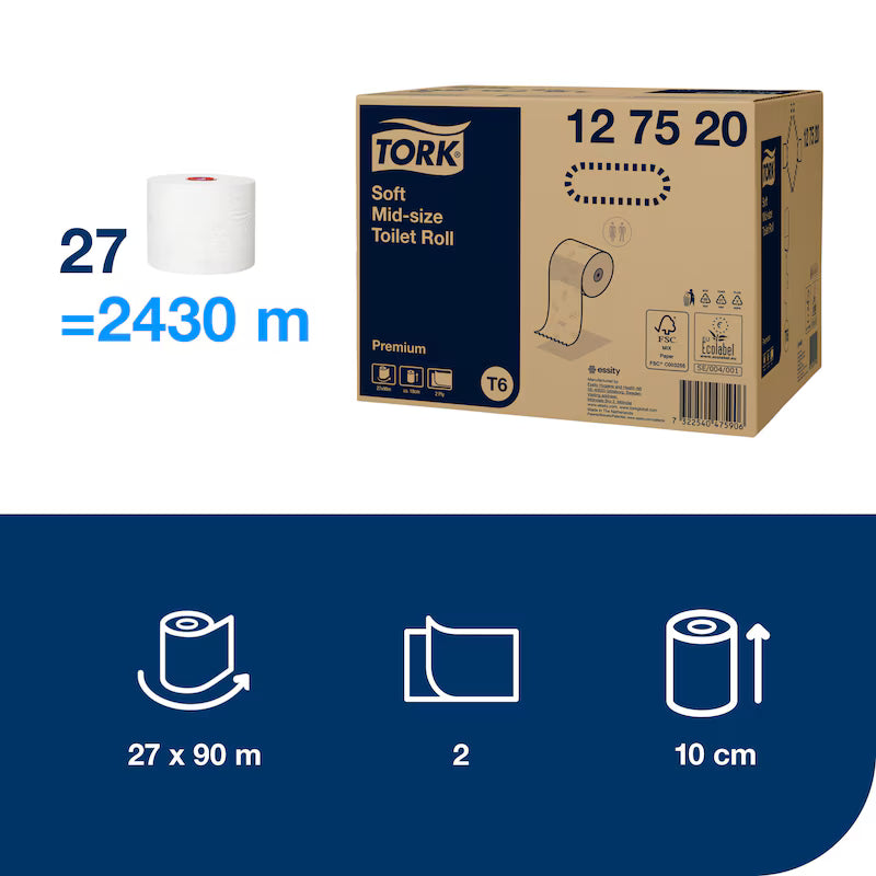 Tork Mid-size Premium Delicat este o hârtie igienică compactă, de calitate Premium, concepută pentru dozatoarele Tork Twin Mid-size din sistemul T6. Oferă un aspect alb strălucitor și o textură delicată, potrivită pentru toaletele cu trafic redus și mediu.