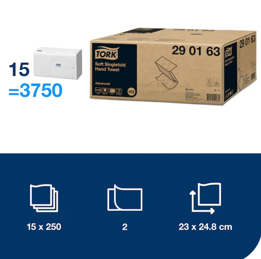 Prosoape pentru Mâini, Tork Soft Singlefold, Alb, H3 (15 PAC/BAX) - 290163