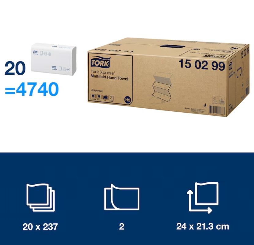Prosoape pentru mâini, Tork Xpress® , Economice, Multifold, Alb, H2, 237 PORTII/PACHET (20 PAC/BAX) - 150299