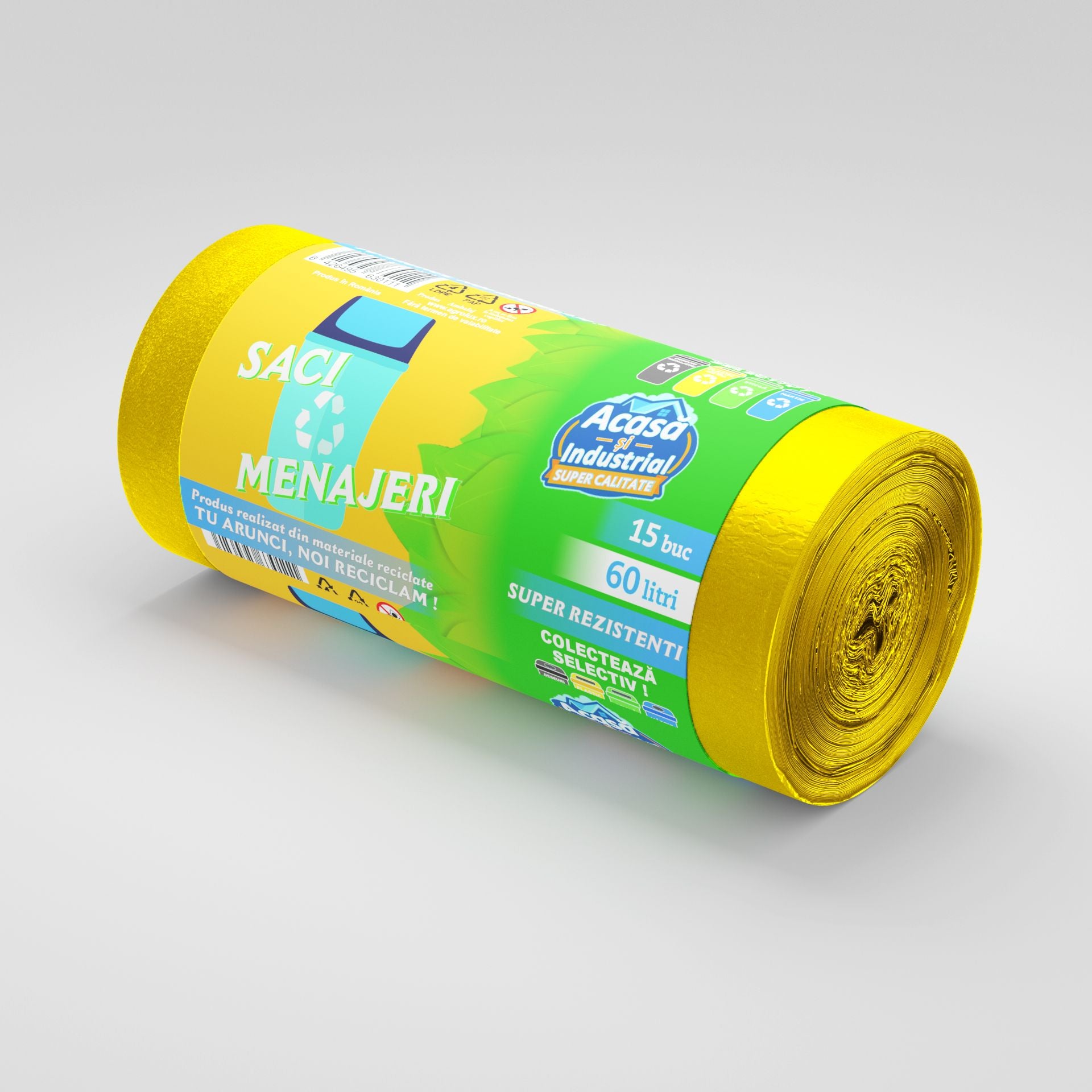 Saci menajeri 60L, galbeni, 15buc/rola, 19 microni, RLDPE