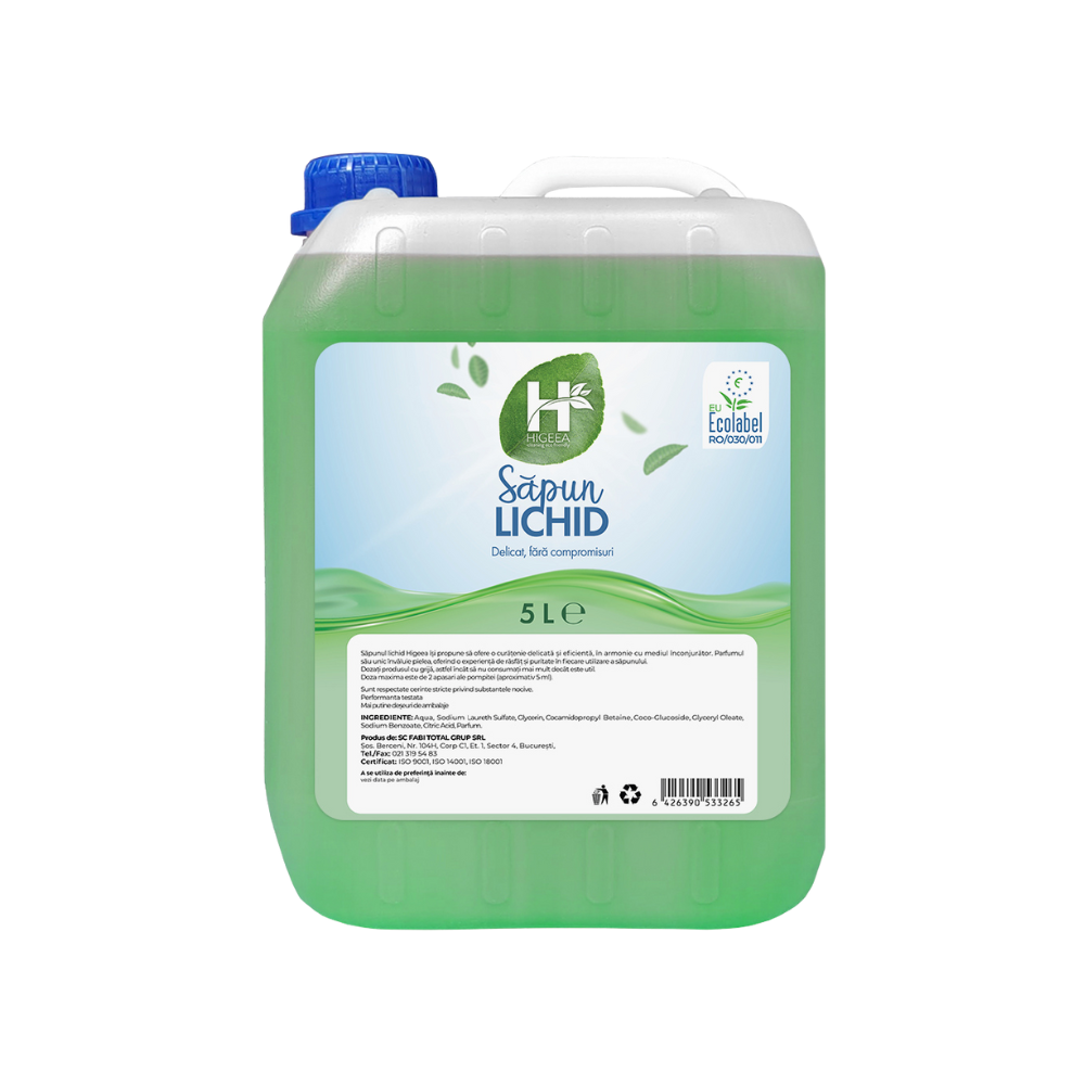 Alege curățenia inteligentă și sustenabilă cu Săpunul lichid Higeea, formulat special pentru a curăța delicat pielea, păstrându-i hidratarea naturală. Ideal pentru utilizarea frecventă acasă, în birouri, restaurante, școli sau spații comerciale.